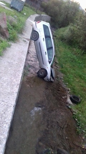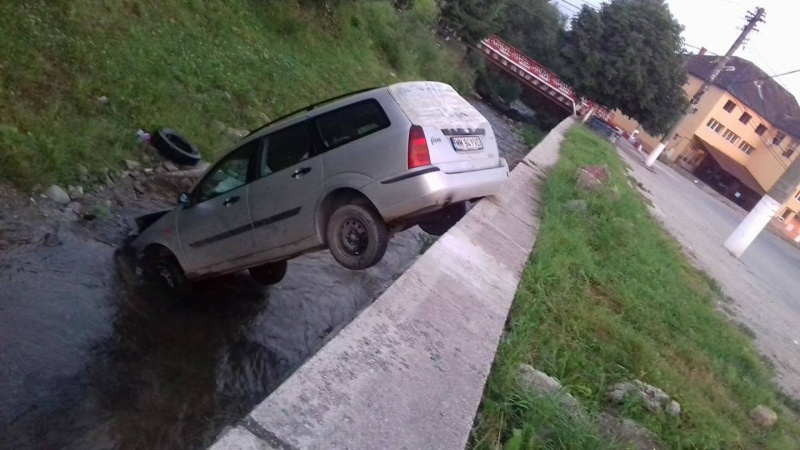 Şoferul unui autoturism a reuşit performanţa de a-şi parca maşina în albia unui pârâu din centrul localităţii.