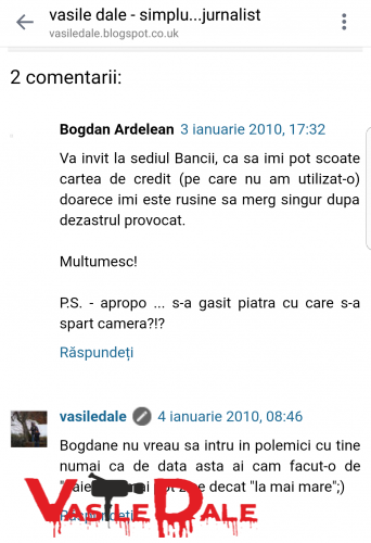 „Buna ziua domnule Vasile Dale ! Cautand sa aflu cat mai multe amanunte din viata unui excroc pe nume Gheorghe Bogdan Ardelean ( sustin cu probe ceeia ce afirm ) am gasit un articol de al dv.in anul 2010 http://vasiledale.blogspot.ro/2010/01/bogdan-ardelean-tanarul-de-18-ani-ajuns.html , pentru că acum 7 ani l-ati categorist bine un mic infractor ,as putea daca sunteti interesat sa va furnizez date concrete despre cum a evoluat activitatea lui infractionala de atunci si pana astazi. Daca doriti sa continuati articolul bazat pe probe reale si concrete va pot furniza informati. Stiu ca pentru asta trebuie sa va informati din 3 surse. Va pot oferi asta cat si numarul de inregistrare al dosarelor care sunt deschise pentru infractiunile de excrocherii, santaj, amenintari etc.in orasul Luton si Birmingham (Anglia) unde si a luat identitatea de George Ardelean si a infiintat un birou sub denumirea „Centrul comunitar pentru romani din Luton” sub umbrela caruia a inselat zeci si zeci de romani. Detinem declaratiile celor inselati, inregistrari telefonice, inscrisuri etc pentru ceeia ce afirm. Daca doriti sa continuati ca un serial articolul pe care l-ati publicat atunci si așa cum bine ati intuit acum 7 ani despre acel mic infractor care intre timp a devenit un infractor in toata regula, contactati-ma !” este mesajul disperat al unei românce.