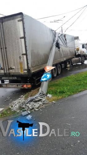 Trafic paralizat pe bulevardul Bucuresti din Baia Mare, in sensul giratoriu de la Dedeamn. Soferul unui autotren inmatriculat in Rusia a agatat firele electrice de pe stalpii din zona pe care le-a rupt.