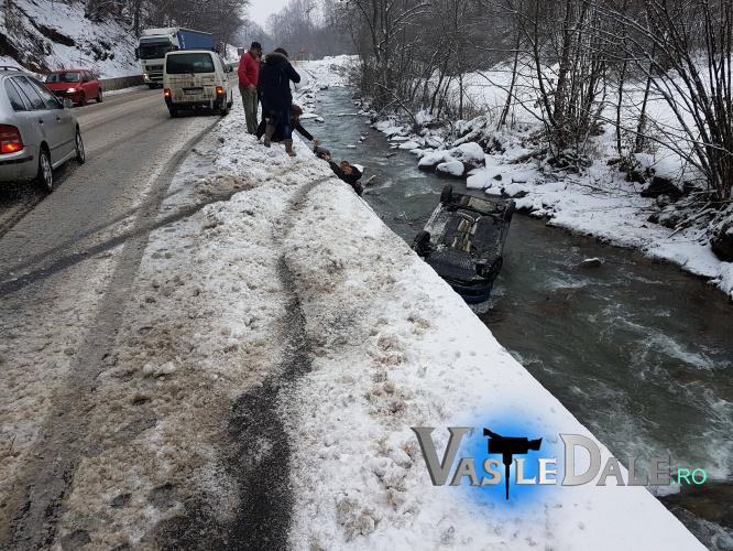 O soferita circula cu autoturismul dinspre Baia Mare spre Sighetu Marmatiei. Intr-o curba la dreapta, pe un carosabil acoperit cu zapada framantata, aceasta a pierdut controlul volanului si a plonjat in albia paraului Izvorul Negru, pe plafon. Din fericire aceasta a scapat teafara, insa masina a fost avariata.