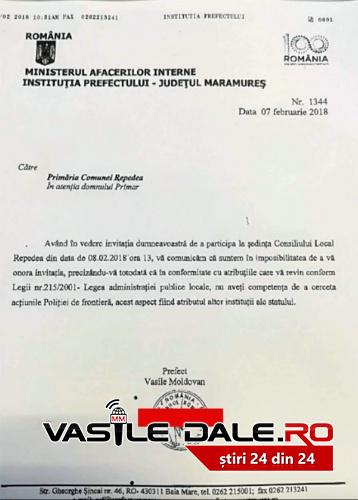 Prefectul județului, dl. Vasile Moldovan, a trimis Primarului comunei Repedea un răspuns scris prin care arată că refuză invitația de a participa la ședința de CL, precizând totodată că nici Primarul și nici Consiliul local nu au atribuții sau „competența de a cerceta acțiunile Poliției de frontieră, acest aspect fiind atributul altor instituții ale statului” (vezi FOTO la baza articolului – facsimil: răspunsul Prefectului județului Maramureș).