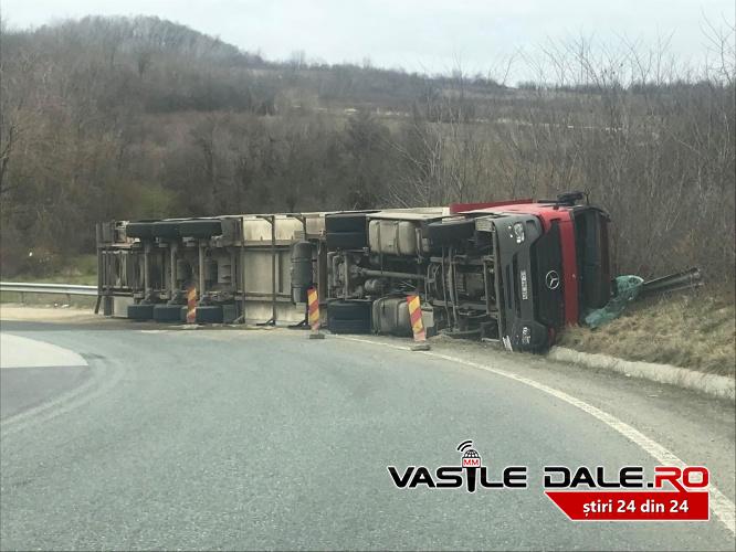 Un TIR înmatriculat în Republica Moldova se deplasa pe ruta Dej – Baia Mare. La un moment dat,într-o curbă periculoasă la dreapta, şoferul a pierdut controlul volanului, a trecut pe contrasens şi s-a răsturnat în şanţul din stânga direcţiei de mers.