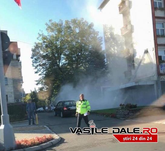 Un fum gros iese din clădirea primăriei, angajaţii autoevacuându-se.