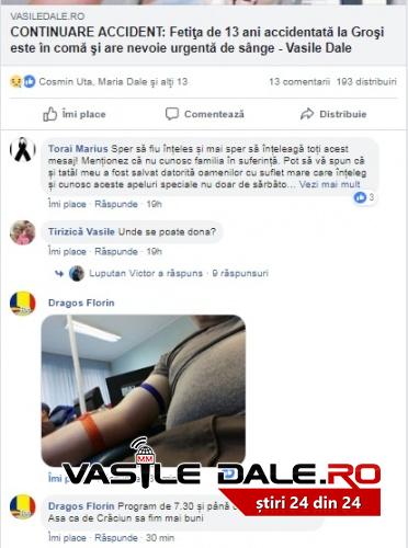 Site-ul nostru a publicat ieri, preluand o postare de pe facebook, un anunt disperat conform caruia era mare nevoie de sange pentru micuta Larisa (13 ani), ranita grav in accidentul produs sambata 22 decembrie 2018, pe drumul national 18B la Grosi.