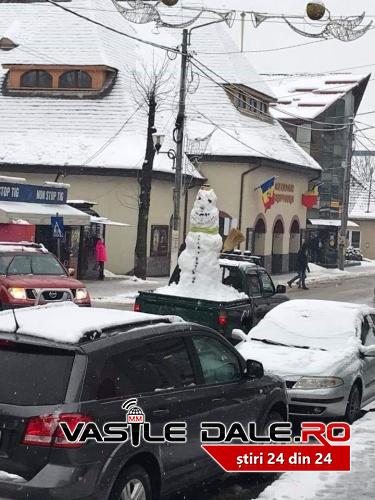 Un cititor al nostru a surprins fotografii cu omul de zapada plimbat pe strazile orasului Borsa.