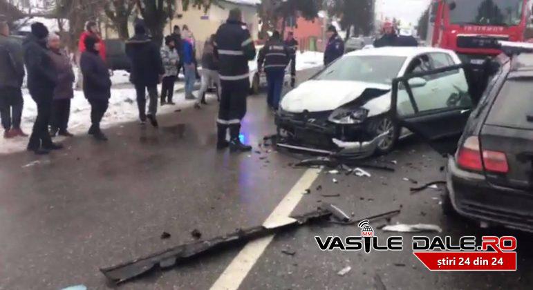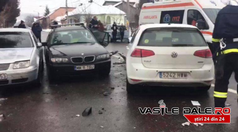 În carambol au fost implicate trei autoturisme, rezultând mai mulţi răniţi.