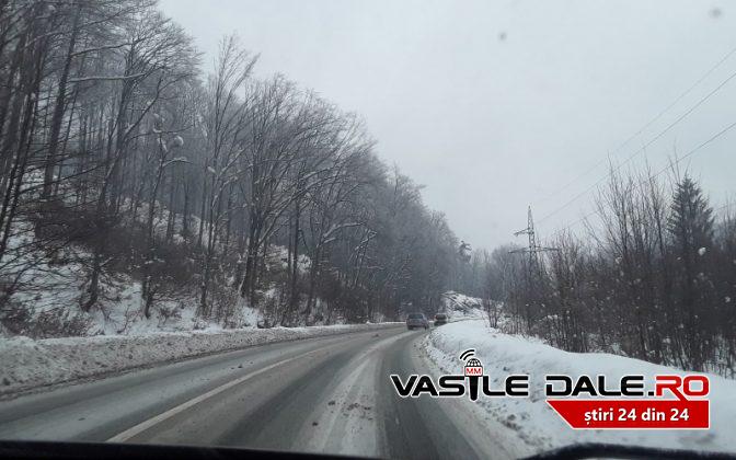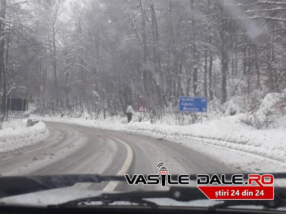 La fel este pe acelasi drum national 18, in pasul Gutai. Acolo, la aceasta ora pe partea carosabila este 1-2 cm de zapada amestecata cu material antiderapant.