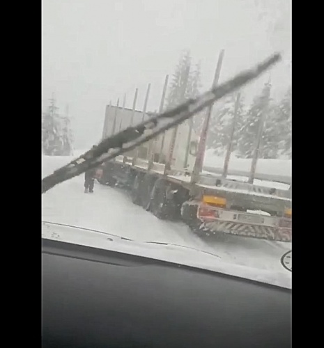 În imagini se vede clar drumul acoperit cu zăpadă, care a înghețat rapid iar tranzitarea muntelui a fost o adevărată aventură pentru participanții la trafic. Mulți au fost nevoiți să tragă pe dreapta – este cazul TIR-iștilor și să aștepte ca în zonă să își facă apariția utilajele de deszăpezire pentru a arunca material antiderapant.