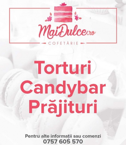 trebuie să-l procuri. Cofetăria Mai Dulce, situată chiar în centrul Băii Mari (Bd. București nr. 8) este pregătită să preia comenzi speciale de torturi personalizate, la care nicio femeie nu va rămâne indiferentă. Opțiunile sunt practic, infinite, în ceea ce privește aspectul torturilor, fie că vei alege o glazură de ciocolată, una roșie sau roz sau un tort acoperit cu pastă de zahăr, cu imagine printată sau figurine. Nu trebuie să lipsească mesajele scrise, de la un simplu “La mulți ani!”, la scurte declarații de dragoste, precum și simbolurile primăverii și ale iubirii. Căci, de fapt, tot ceea ce își doresc femeile este să știe (și să li se repete mereu) că sunt iubite fără măsură și apreciate pentru calitățile lor.