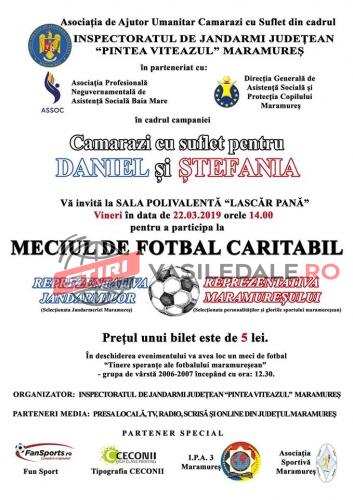 Jandarmii maramureşeni, prin Asociaţia de ajutor umanitar ,,Camarazi cu suflet” în parteneriat cu Direcţia Generală de Asistenţă Socială şi Protecţia Copilului Maramureş și cu Asociaţia Profesională Neguvernamentală de Asistenţă Socială ASOOC Baia Mare, organizează un meci de fotbal cu scop caritabil. Scopul campaniei ,,Camarazi cu suflet pentru Ștefania și Daniel”, este de a ajuta pe Ștefania Daniela Conya, elevă a Liceului de Artă Baia Mare, în vederea achiziţionării unui scaun cu rotile electric pentru a putea frecventa cursurile unității de învățământ și pe Daniel Vasile Oanță, elev al Şcolii Gimnaziale ,,Vasile Alecsandri” din Baia Mare, care necesită protezare la antebraţ, mâna stângă.