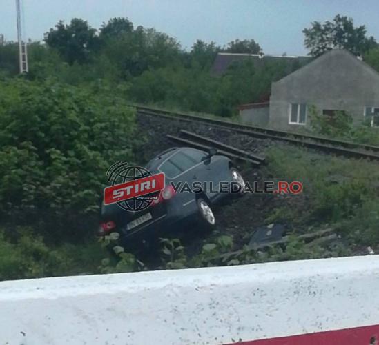 Nu se ştie din ce cauză, şoferul unui autoturism Volkswagen a zburat în boscheţii de pe marginea căii ferate.