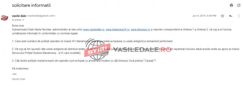 ” Buna ziuaSubsemnatul Dale Vasile Nicolae, administrator al site-urilor www.vasiledale.ro, www.baiamare24.ro, www.dejnews.ro și reporter corespondent al Antena 1 și Antena 3, vă rog a-mi furniza următoarele informații în conformitate cu normele legale.