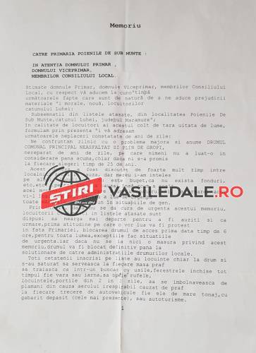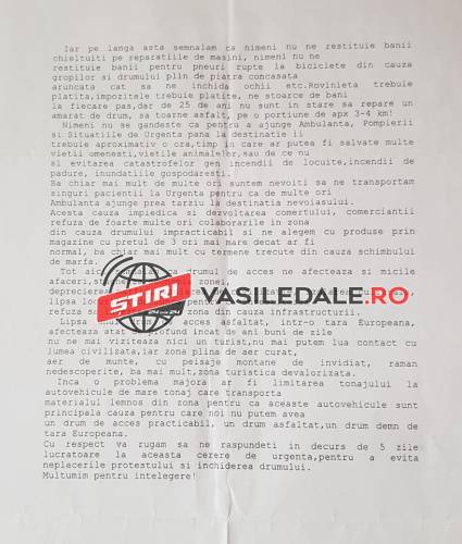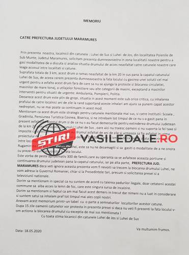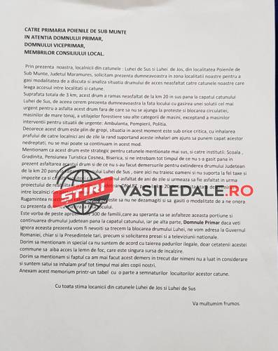 „Prin prezenta localnicii din cătunele: Luhei de Sus și Luhei de Jos (comuna Poienile de Sub Munte) solicităm asfaltarea drului spre cătune. Suprafața totală de 3 km, acest drum a rămas neasfaltat de la km 20 și până la capătul cătunului Luhei de Sus. De aceea cerem prezenta dvs la fața locului cu găsirea unei soluții cel mai urgent pentru a asfalta acest drum. În caz contrar se va ajunge la PROTESTE ȘI BLOCAREA CIRCULAȚIEI, mașinilor de mare tonaj, a utilajelor forestiere sau alte categorii de mașini. Excepție vor fi mașinile de intervenții pentru situații de urgență: Ambulanța, Pompierii, Poliția. (…)