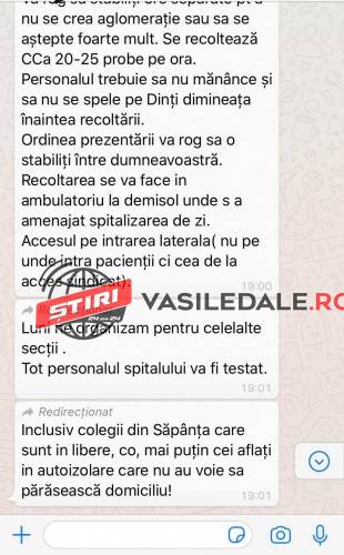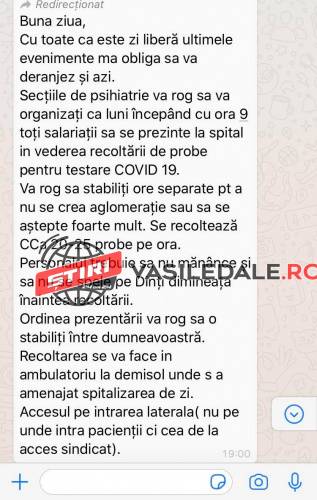 ”Bună ziua. Cu toate că este zi liberă ultimele evenimente mă obligă să vă deranjez și astăzi. Secțiile de psihiatrie vă rog să vă organizați ca luni începând cu ora 9.00 toți salariații să se prezinte la spital în vederea recoltării de probe pentru testare COVID-19.
