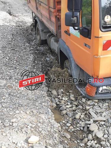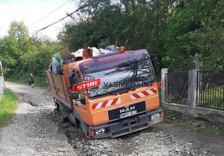 Mașina de salubritate cu greu a fost scoasă din noroi. Și asta abia după ce în zonă a fost adusă o macara pentru a o putea tracta.