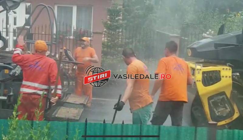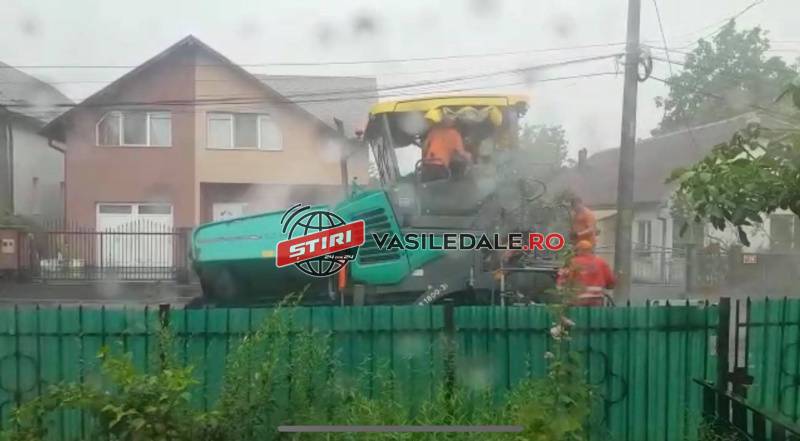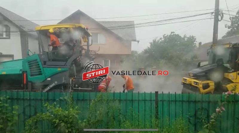 Muncitorii care reabilitează o stradă din Baia Mare lucrau de zor și turnau asfaltul proaspăt cu toate că ploua torențial. Cu toate acestea, utilajele și muncitorii nu au avut o problema în a-și finaliza munca.