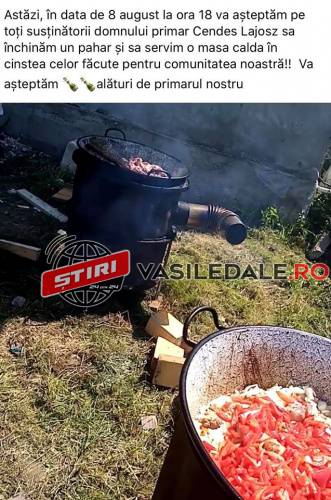 ”Astăzi, în data de 8 august la ora 18 vă așteptăm pe toți susținătorii domnului primar Csendes Lajos sa închinăm un pahar și să servim o masa caldă în cinstea celor făcute pentru comunitatea noastră!! Vă așteptăm 🍾🍾alături de primarul nostru. Vă invităm și pe cei care nu sunt cu noi că avem de unde! Vă mulțumim pentru susținere” este mesajul postat în mediul online.