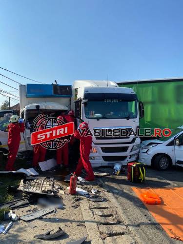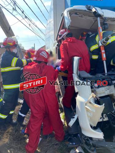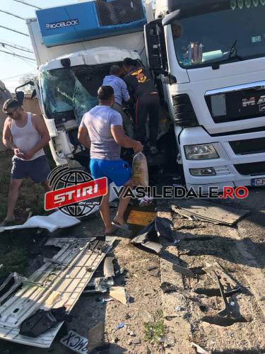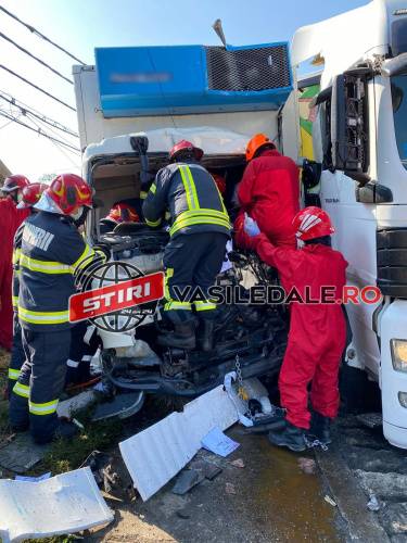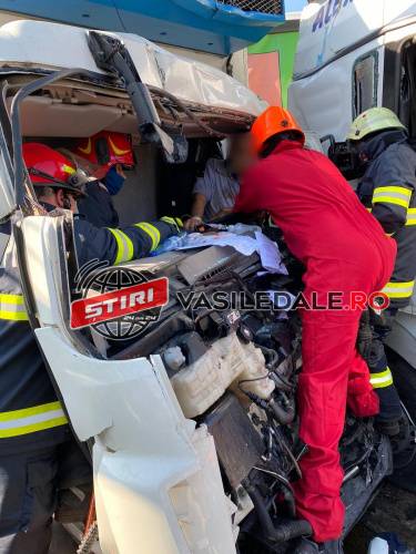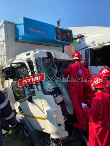 “Două autospeciale cu modul de descarcerare și două echipaje SMURD au fost alertate, în jurul orei 10.00, ca urmare a unui grav accident rutier în care au fost implicate două autotrenuri și un autoturism.