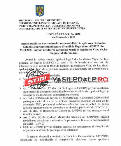 Comitetul Județean pentru Situații de Urgență Maramureș a primit Ordinul Șefului Departamentului pentru Situații de Urgență, Secretar de Stat Dr. Raed Arafat nr. 4659722/2020 privind instituirea carantinei zonale în localitatea Vișeu de Jos, pentru o perioadă de 14 zile, a declarat președintele CJSU, prefectul Nicolae-Silviu Ungur.