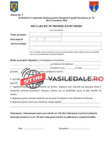 În aplicarea prevederilor Ordinului Șefului Departamentului pentru Situații de Urgență nr. 4659722/2020 privind instituirea carantinei zonale în localitatea Vișeu de Jos, județul Maramureș, se aprobă modelul de Declarație pe proprie răspundere din care să rezulte motivul justificat al deplasării conform Anexei nr. 1 care face parte integrantă din prezenta hotărâre.
