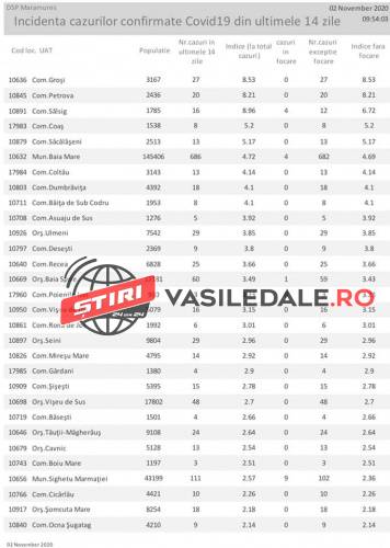 Până în prezent municipiul Baia Mare și orașele Ulmeni și Baia Sprie sunt teoretic în zonă roșie. Baia Mare are 4,69 la o mie de locuitori, Baia Sprie are 3,43 iar Ulmeni are 3,85. Alături de aceastea sunt comunele Groși (8,53 – carantinată), Petrova (8,21 – carantinată), Sălsig (6,72), Coaș (5,2), Săcălășeni (5,17), Coltău (4,14), Dumbrăvița (4,1), Băița de Sub Codru (4,1), Asuaju de Sus (3,92), Desești (3,8), Recea (4,66 – carantinată), Poienile Izei (3,23), Vișeu de Jos (3,15 – carantinată) și Rona de Jos (3,01)