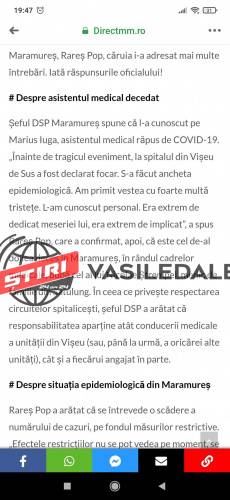 Noi am publicat în 11 noiembrie o știre în care anunțat focar Covid-19 la Spitalul Orășenesc Vișeu de Sus. Incompetenții de la DSP prin CJSU Maramureș au negat focarul. Culmea este că incompetentul Rareș Pop a declarat pentru directmm.ro că 9 cadre medicale au fost confirmate pozitiv și că a fost focar.
