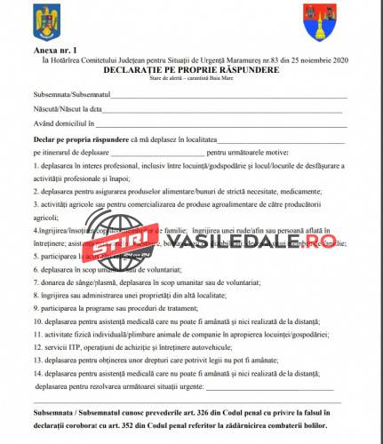 Comitetul Județean pentru Situații de Urgență Maramureș este abilitat să informeze opinia publică despre faptul că au fost inițiate la nivel central, având în vedere analiza evoluției situației epidemiologice, procedurile stabilite de legislația în vigoare pentru prelungirea măsurii de carantină zonală a municipiului Baia Mare, începând de astăzi, 25 noiembrie a.c., ora 17.00.