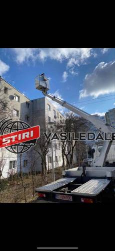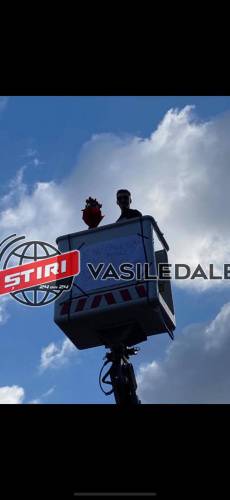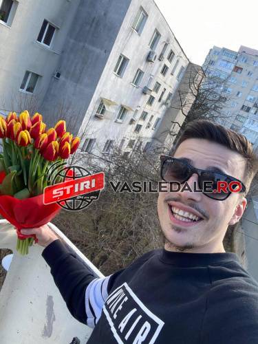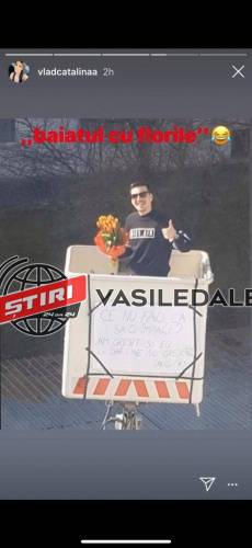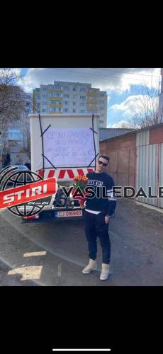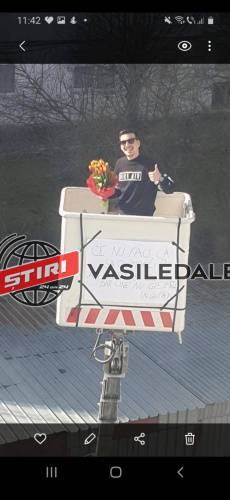 Apoi, având un buchet de flori în mână, s-a urcat pe platforma care l-a ridicat la nivelul geamului unde locuieşte tânăra respectivă.