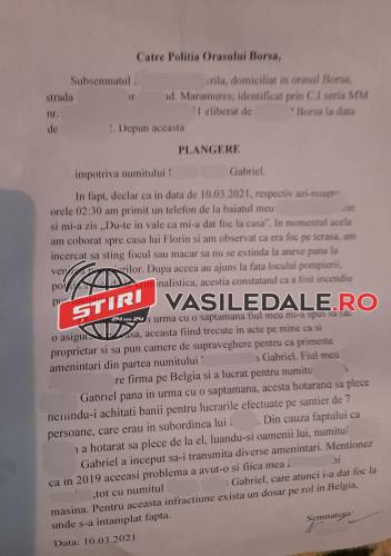 ”Buna ziua , sunt Florin B., casa mea a fost incendiată intenționat azi-noapte in jurul ore 2:30 în Borșa/Popoșală (9/10 martie 2021). Eu locuiesc in Belgia. Am o firmă de construcții. Am lucrat pentru Gabriel M.T. Săptămâna trecută l-am anunțat ca nu mai vrea sa lucrez cu el din nenumărate motive. La telefon mi-a spus că nu va rămâne așa. Am luat-o ca pe o amenințare, mai ales că el anul trecut, i-a dat foc masinii cumnatului meu, aici în Belgia. Motivul a fost același – nu a mai vrut să lucreze cu el. Zilele trecute am fost informat de către niște persoane aici din Belgia că acest Gabriel se lauda că mă amenință că îmi da foc. Mă așteptăm la asta de aceea am început să iau câteva măsuri de siguranță dar din păcate a fost prea târziu. Este un om periculos și are mulți oameni ”mai mari” pe care se bazează! Săptămâna trecută Gabriel a fost în România și s-a întors duminica aceasta. Bănuiesc că atunci a plănuit totul deoarece el nu vorbește niciodată la telefon decât pe whatsapp. Mereu spunea că îi sunt ascultate telefoanele. El a mai dat foc și altor 3 mașini al unui var de-al lui din Baia Mare din același motiv: nu a mai vrut să lucreze pentru el. Acest caz este deja în instanță din câte știu. Vreau să se știe adevărul despre acest caz și lumea să se ferească de el. Repet: este un om periculos, cu mulți bani, care se bazează pe alte persoane. Nu acționează niciodată singur. Aici în Belgia este deja cunoscut având nenumărate plângeri la poliție și zeci de mii € datorii la persoanele care au lucrat pentru el. Vreau ca poliția să își facă treaba!” ne-a scris fiul proprietarului.