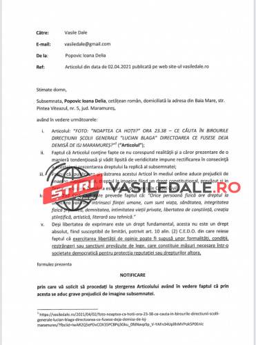 Așa cum spuneam și în urmă cu două zile, Școala “Lucian Blaga” din Baia Mare a cam devenit  în ultima vreme stat în stat. Cu toate că în 1 aprilie 2021, Inspectoratul Școlar Maramureș a emis decizia 821 de încetare a detașării în funcția de director la Școala Generală ”Lucian Blaga” Baia Mare a dnei profesor Popovič, în seara aceleași zile se pare că fosta directoare era în incinta unității de învățământ.