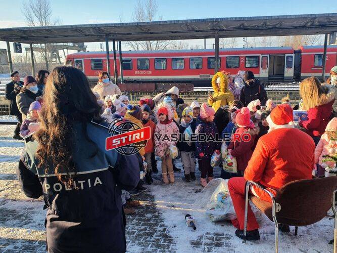 Astăzi, 21 decembrie, Moș Crăciun a poposit în gara CFR din Baia Mare, unde peste 60 de preșcolari de la Grădinița Floare de Colț l-au așteptat cu sufletul la gură. Între atâția copii, Moșul a avut nevoie de ajutoare pentru a le înmâna cadourile. Și cine să fie mai potriviți pentru acest rol decât cei care asigură liniștea și ordinea publică în perimetrul stației CFR, polițiștii Biroului Transporturi Maramureș.