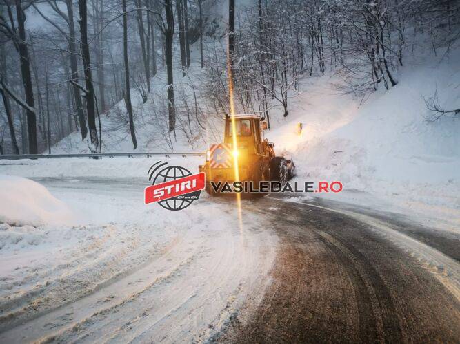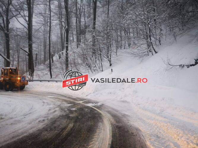 Pe DN 18, în Pasul Prislop, se acționează cu utilaj cu lamă și material antiderapant pentru îndepărtarea copacului căzut pe carosabil sub greutatea zăpezii.
