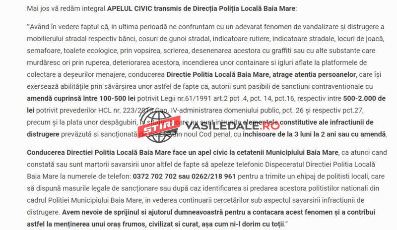 Cei doi polițiști locali sunt aceeași care de la începutul lunii martie 2022 și până în prezent au reușit să identifice 10 tineri care vandalizau orașul cu graffity. Nu au scăpat de ”operele de artă” cinematograful Dacia, coșurile de gunoi, toate băncile din Baia Mare și mai nou, indicatoarele stradale.