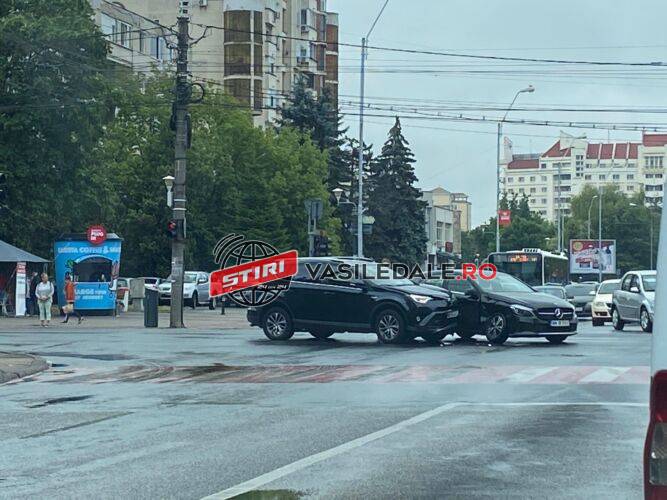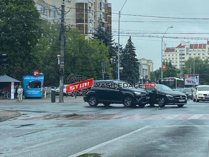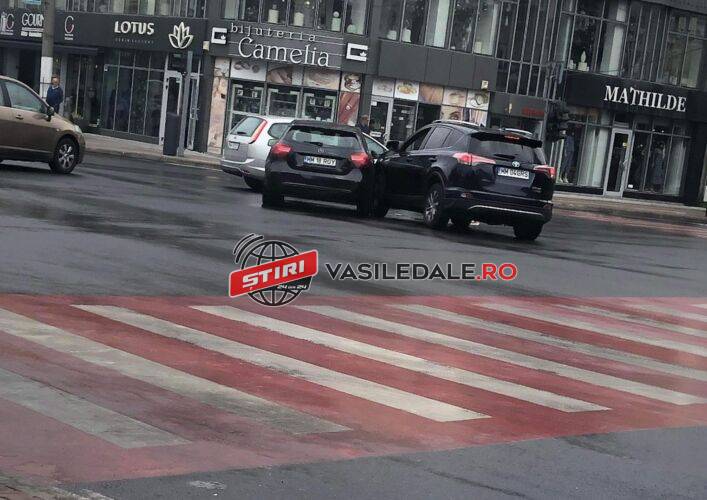 Impactul dintre două autoturisme a fost cauzat de un şofer care a forţat culoarea galbena a semaforului. Din fericire nu au fost victime, doar traficul este îngrerunat.