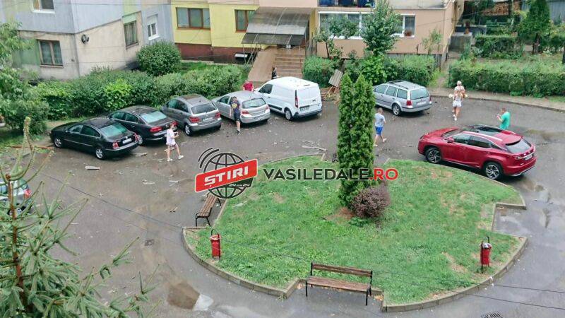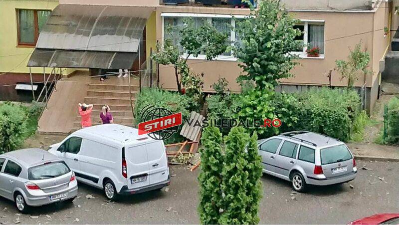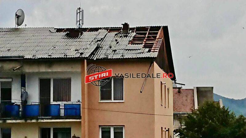 În cartierul Nucului din Sighetu Marmației o parte din acoperișul unui bloc a fost luat de vânt și aruncat peste mașinile parcate.