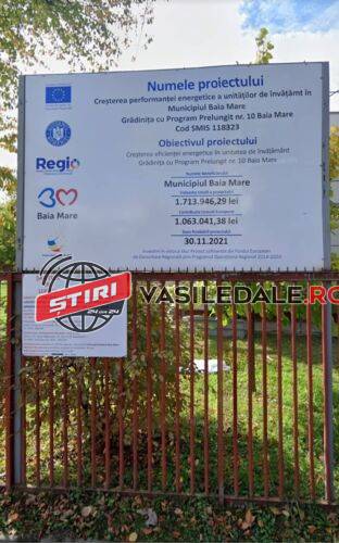 Zilele următoare vom continua și cu alte exemple. Astăzi ne oprim la Grădinița Nr. 10: ”Creșterea performanței energetice a unităților de învățământ în municipiul Baia Mare. Grădinița cu Program Prelungit nr. 10 Baia Mare. Valoarea totală a proiectului: 1.713.946,29 lei (1.063.041,38 lei contribuția Uniunii Europene). Data finalizării proiectului: 30 noiembrie 2021. Ulterior s-a adaugat un panou mai micuț cu un termen de finalizare actualizat: 30 septembrie 2022.