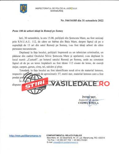 ACTUALIZARE – Au fost tăiate 112 cioate de lemn, a fost identificată cantitatea de aproximativ 37 mc care a fost predata proprietarului. Se efectuează verificari, iar în funcție de rezultate, vor fi luate măsurile legale care se impun.