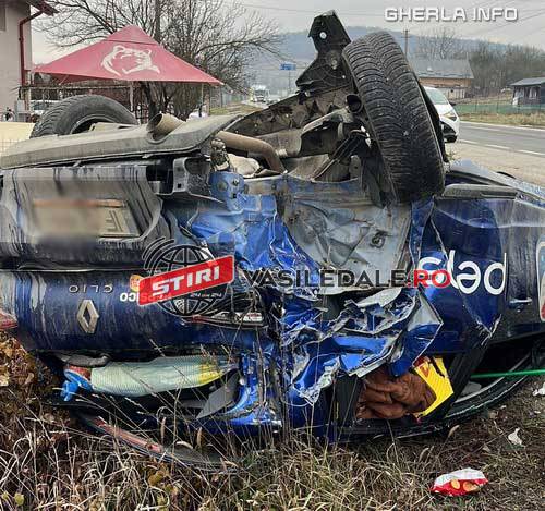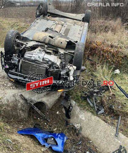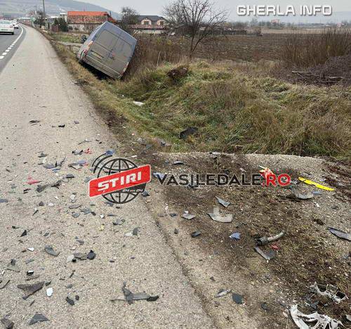 În urma impactului, autoturismul s-a răsturnat, iar duba a părăsit șoseaua și s-a oprit între-un șanț de pământ.