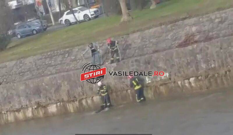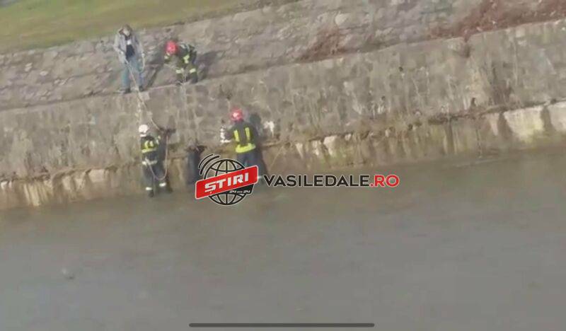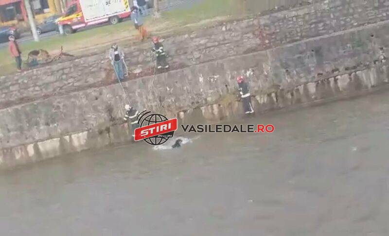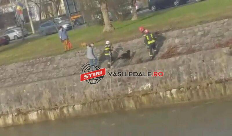 Intervenție contra cronometru a pompierilor pentru salvarea unui câine care a ajuns pe malul betonat al râului Săsar care traverseaza municipiul Baia Mare.