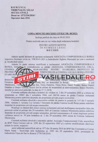 Decizia civilă nr. 88/2023 (9 februarie 2023): ”Admite apelul declarat de apelanta reclamantă Asociația Composesorală Borșa împotriva Sentinței civile nr. 558/30 martie 2021 a Judecătoriei Sighetu Marmației pe care o anulează, rejudcând cauza: