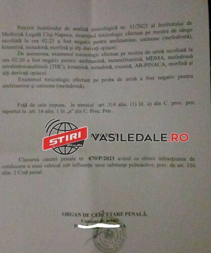 Potrivit buletinului de analiză toxicologică nr. 51/2023 al Institutului de Medicină Legală Cluj-Napoca, examenul toxicologic efectuat pe mostra de sânge recoltată la ora 02.25 a fost negativ pentru amfetamine, catinone (mefedronă), ketamină, metadonă, morfină și alți derivați opiacei.