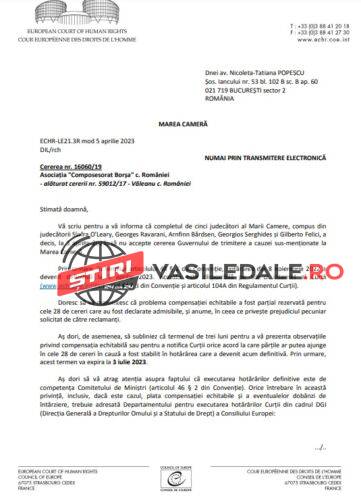 Vă scriu pentru a vă informa că completul de cinci judecători al Marii Camere, compus din judecătorii Síofra O’Leary, Georges Ravarani, Arnfinn Bårdsen, Georgios Serghides și Gilberto Felici, a decis, la 3 aprilie 2023, să nu accepte cererea Guvernului de trimitere a cauzei sus-menționate la Marea Cameră.