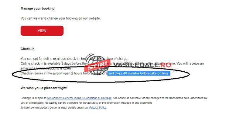 Eu voi face o plângere la ANPC, dar, repet, zburați cu AirConnect doar dacă vă asumați riscul că dacă se întâmplă ceva, n-aveți pe cine să contactați, se poate închide check-in-ul mai repede decât se menționează în mail, să vă revândă biletul și să vă strice sărbătorile, sau, alternativ, mergeți cu 3 ore înainte în aeroport pentru un zbor de o oră.