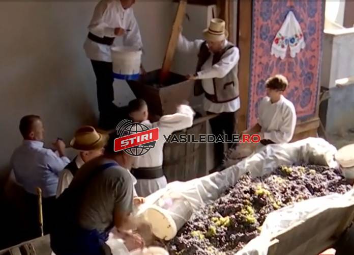 Localnic: Mustul bun prima dată trebuie să fie copţi strugurii. După ce s-au cules, îi aducem aici, îi zdrobim şi ia uitaţi acolo se vede foarte frumos cum se sparg boabele de struguri şi curge mustul.
