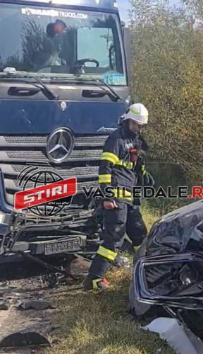 În urma coliziunii dintre un autoturism şi un autocamion au rezultate 3 persoane încarcerate.