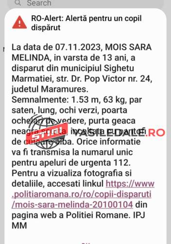 Azi, 07 noiembrie, polițiștii din Sighetu Marmației au fost sesizați de către mama unei minore de 13 ani, din Sighetu Marmației – MOIȘ SARA MELINDA – cu privire la faptul că, în intervalul orar 10.00-12.00, aceasta a plecat voluntar de la domiciliu şi nu a mai revenit.