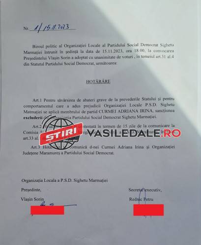 Vezi mai jos în facsimil decizia de excludere din PSD Sighet a consilierului local Curmei Irina Adriana: