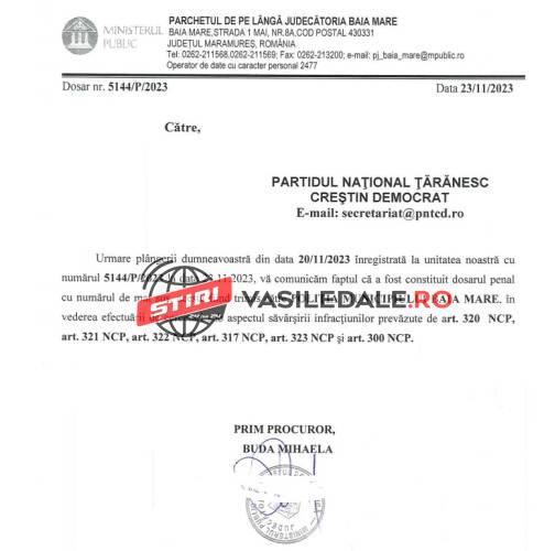 În data de 23 noiembrie 2023, Parchetul de pe lângă Judecătoria Baia Mare a constituit dosarul penal cu numărul 5144/P/2023, ca răspuns la plângerea depusă de PNȚCD prin președintele partidului, Aurelian Pavelescu, și a dispus efectuarea de cercetări sub aspectul săvârșirii infracțiunilor prevăzute de art. 320 NCP, art. 321 NCP, art. 322 NCP, art. 317 NCP, art. 323 NCP și art. 300 NCP.