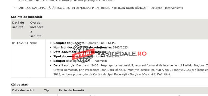 Detalii soluţie: Decizia nr. 2463: Respinge, ca inadmisibil, recursul formulat de intervenientul Partidul Naţional Ţărănesc Creştin Democrat, prin Preşedinte Ioan Doru Dăncuş, împotriva deciziei nr. 498 A din 21 martie 2023 şi a încheierii din 30 mai 2023, ambele pronunţate de Curtea de Apel Bucureşti – Secţia a IV-a civilă. Definitivă.
