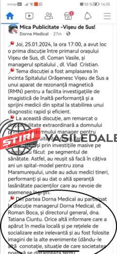 Joi, 25 ianuarie 2024, la ora 17:00, a avut loc o prima discutie intre primarul orasului Viseu de Sus, dl. Coman Vasile, si managerul spitalului, dl. Vlad Cristian.